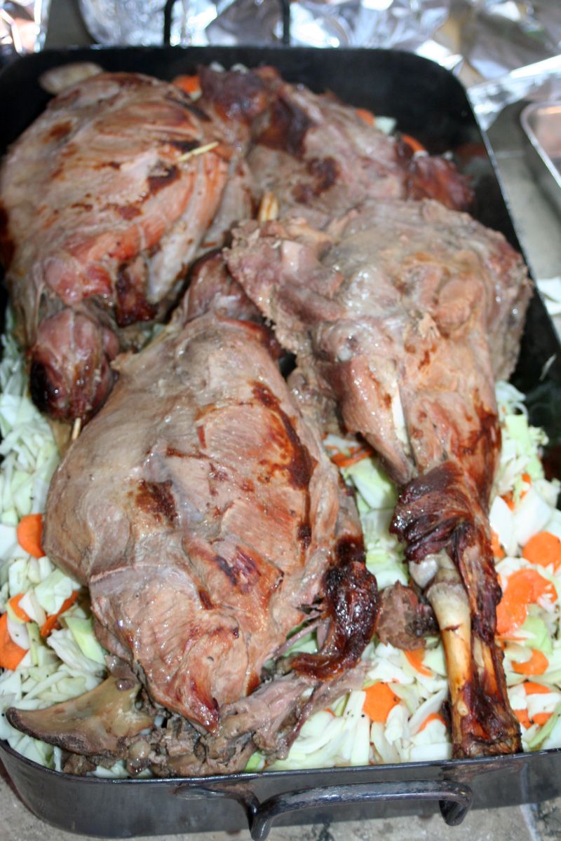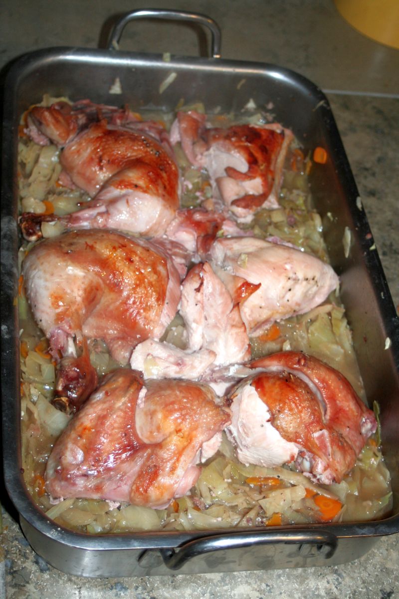 Danach sind die Wildkeulen unter Alufolie abgedeckt für 2 Std im Ofen verschwunden. Während dessen haben wir den Kohl die Karotten und die Zwiebeln geschnitten und alles mit gestoßenem Pfeffer gewürzt. Der Kohl kam dann unter das gesamte Fleisch und ist ab 15.30 Uhr mit in dem Ofen gewesen. Zu dem Hähnchen und dem Mittelstück ist noch je ein Liter Wasser mit dazu gekommen. Die Keulen hatte schon genug Flüssigkeit.